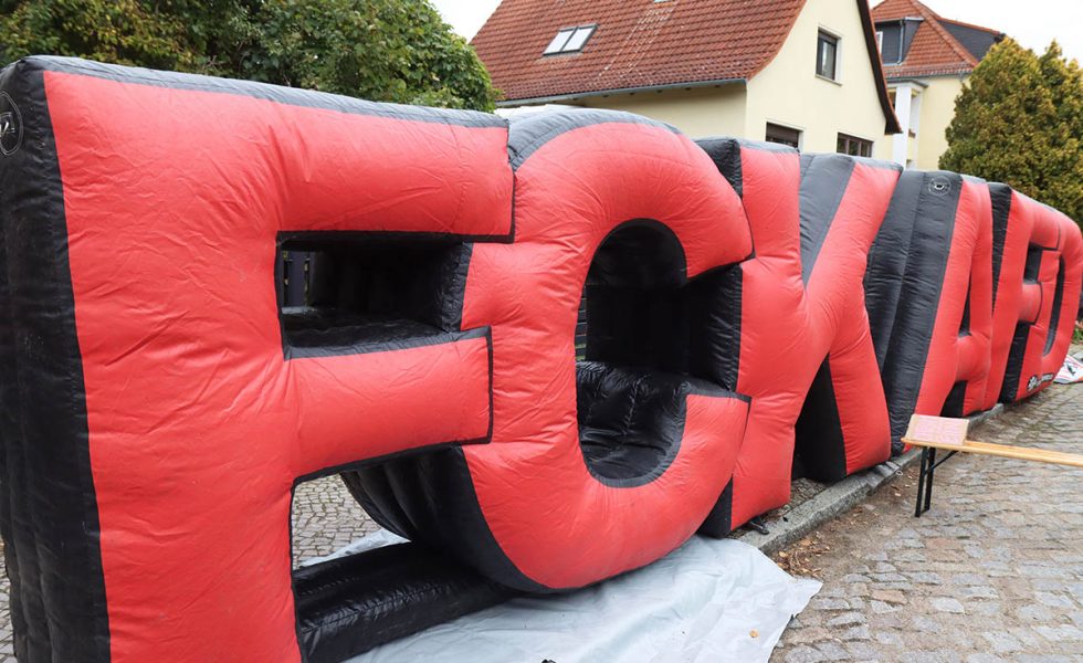 Hunderte Menschen protestierten mit Blockaden gegen einen Parteitag der Berliner AfD am 11. Oktober 2025 im brandenburgischen Jüterbog.