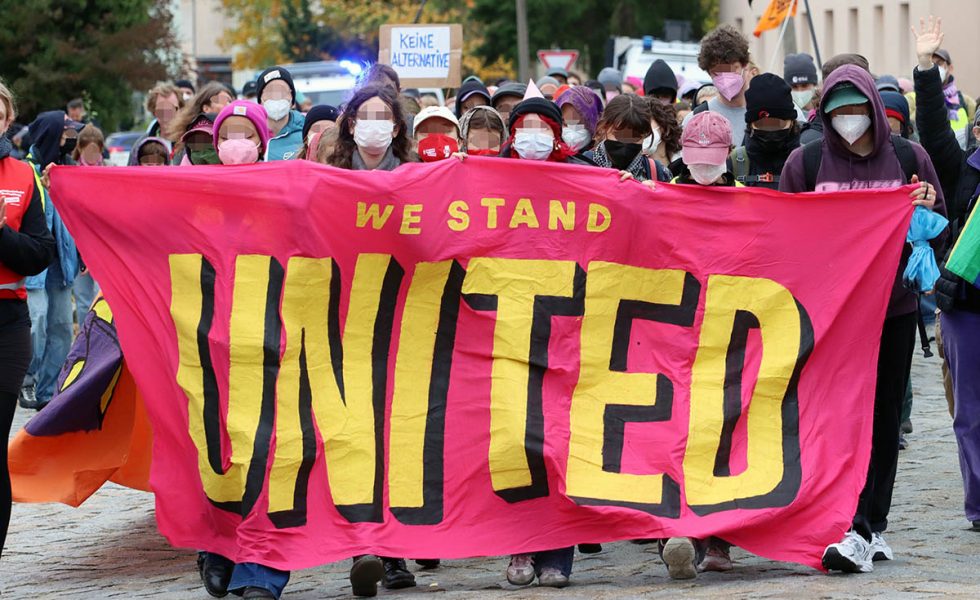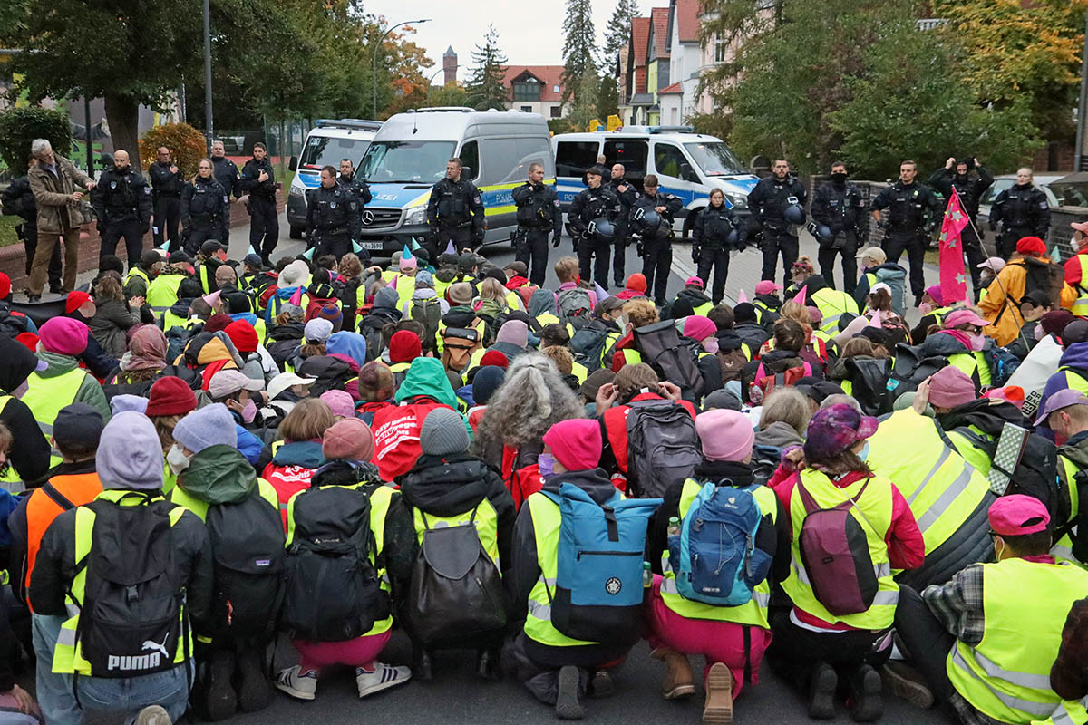 Hunderte Menschen protestierten mit Blockaden gegen einen Parteitag der Berliner AfD am 11. Oktober 2025 im brandenburgischen Jüterbog.