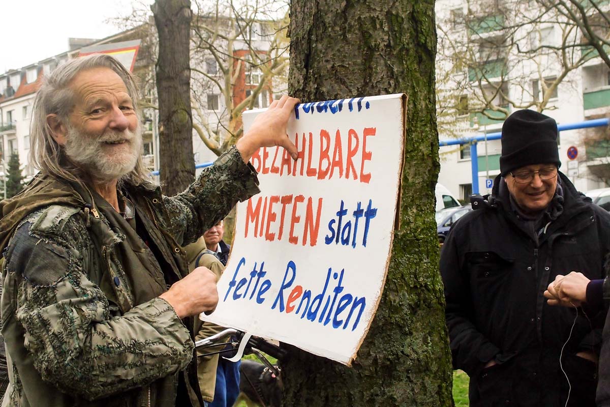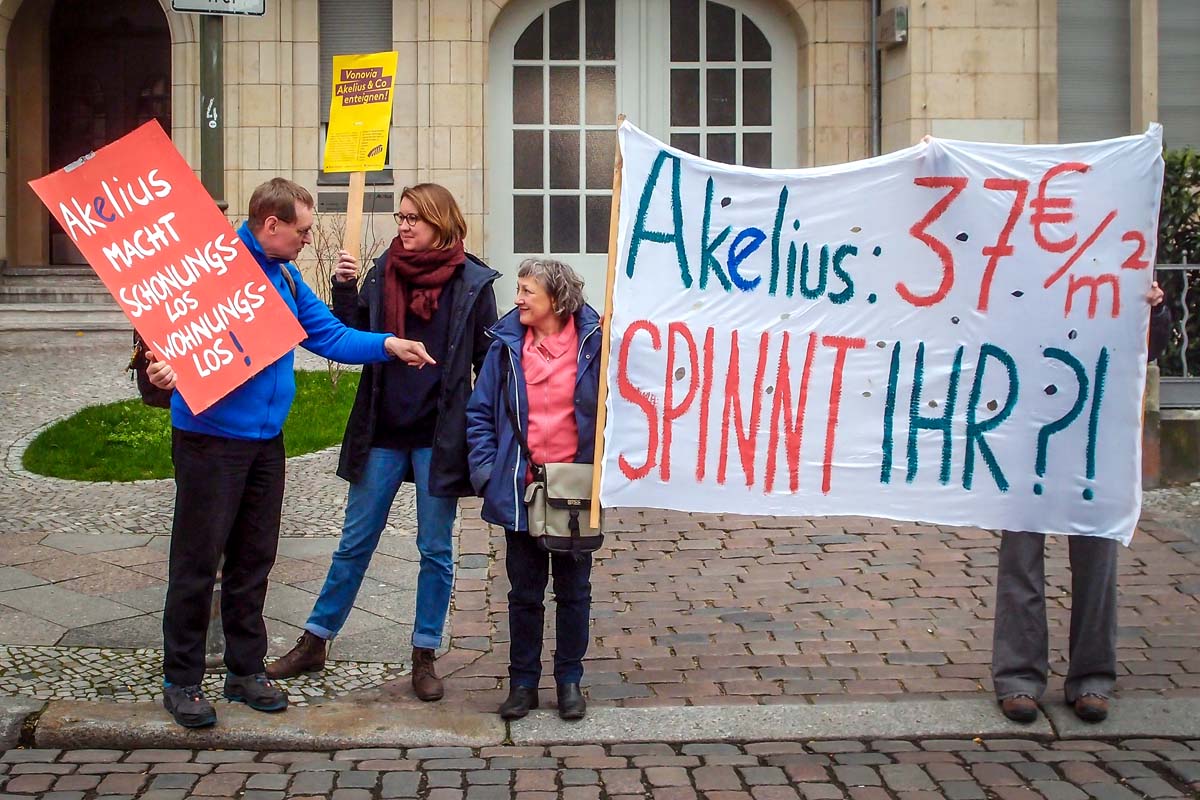 Die Kundgebung fand innerhalb der Aktionstage im Vorfeld der Mietenwahnsinn Demo am 6 April 2019 statt. Das Medieninteresse war groß, ebenso die Solidarisierung von Mieter*innen und ihren Nachbar*innen. An einem Linoldruck-Stand kreierten sich Mieter*innen ihre individuellen „Akelius enteignen!“ T-Shirts. In Redebeiträgen von der Kampagne zur Enteignung der Deutsche Wohnen & Co., des Bündnisses Zwangsräumung verhindern, des Hauses Sonnenallee 154 (das einen Kauf ihres Hauses durch Akelius abzuwehren versucht) und der Vernetzung der Akelius-Mieter*innen wurde der allgemeine Mietenwahnsinn und der besondere durch Akelius angeprangert.