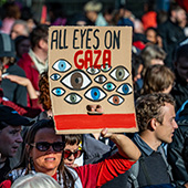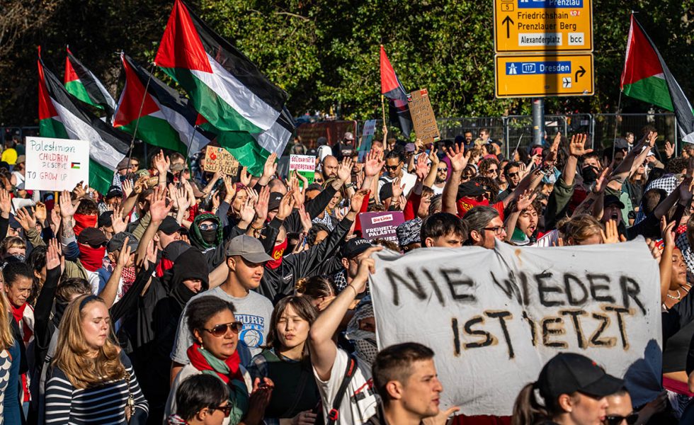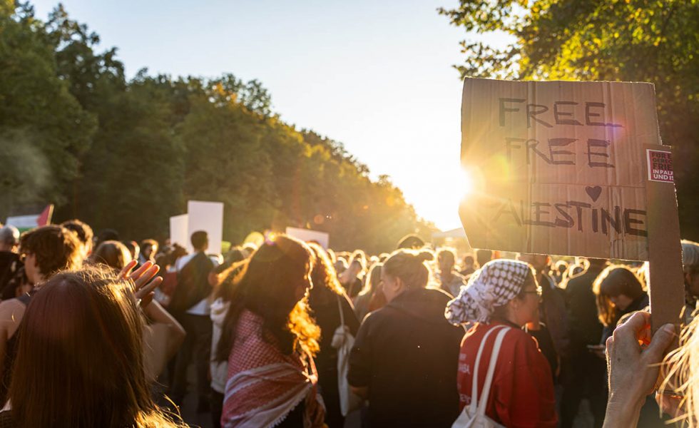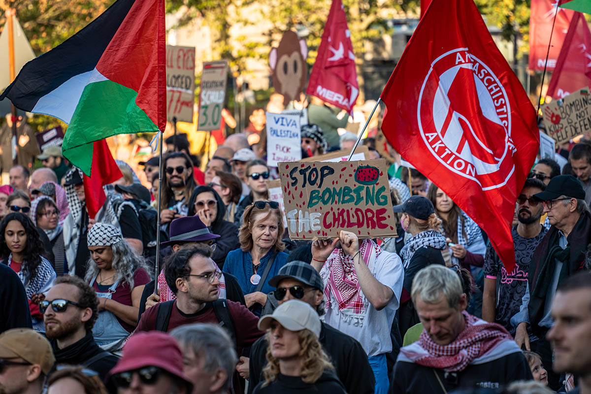 Unter dem Titel „All Eyes on Gaza – Stoppt den Genozid!“ demonstrierten am 27. September 100.000 Menschen in Berlin für ein Ende des Krieges in Gaza, für den Stopp deutscher Waffenlieferungen nach Israel und für einen ungehinderten Zugang humanitärer Hilfe für die Menschen im Gazastreifen. Ein Bündnis aus mehr als 50 Organisationen, Verbänden und Einzelpersonen hatten die Versammlung organisiert, darunter propalästinensische Gruppen, jüdische Aktivist*innen, Medico International, Amnesty International und die Partei Die Linke.