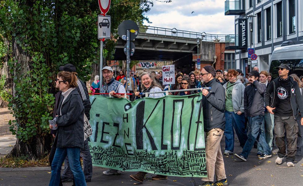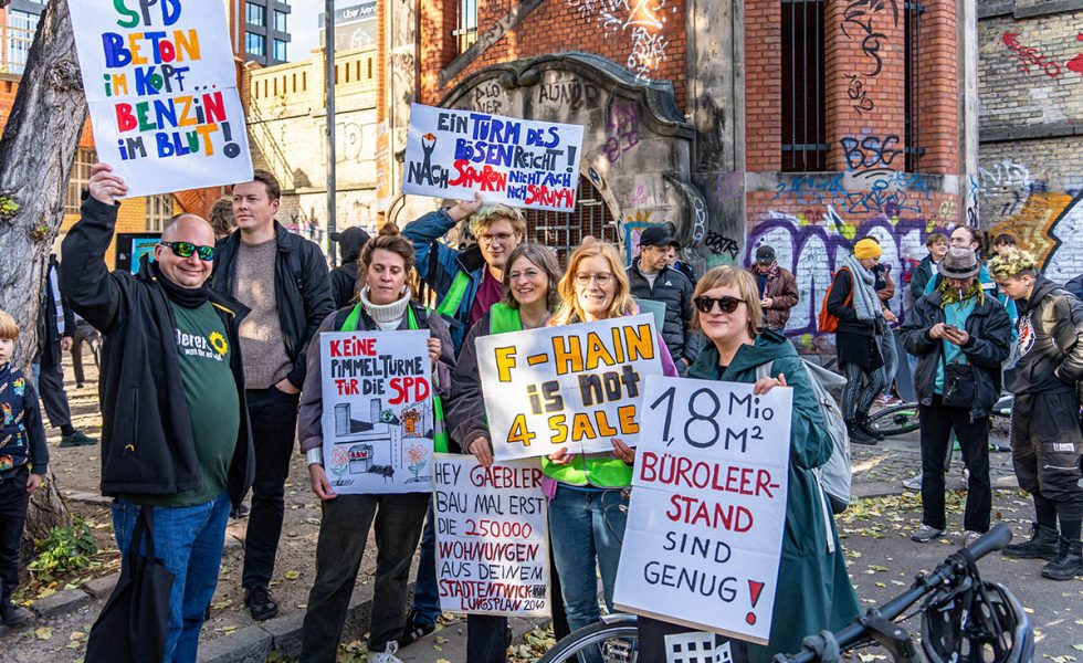 Rund 150 Menschen protestierten am 11. Oktober 2025 in Friedrichshain gegen den Ausverkauf der Stadt, den geplanten Bau weiterer Wolkenkratzer an der Warschauer Straße und die fortschreitende Gentrifizierung im Bezirk. Investoren planen dort zwei weitere Hochhäuser für ein Hotel, Luxuswohnraum und Gewerbeflächen.