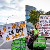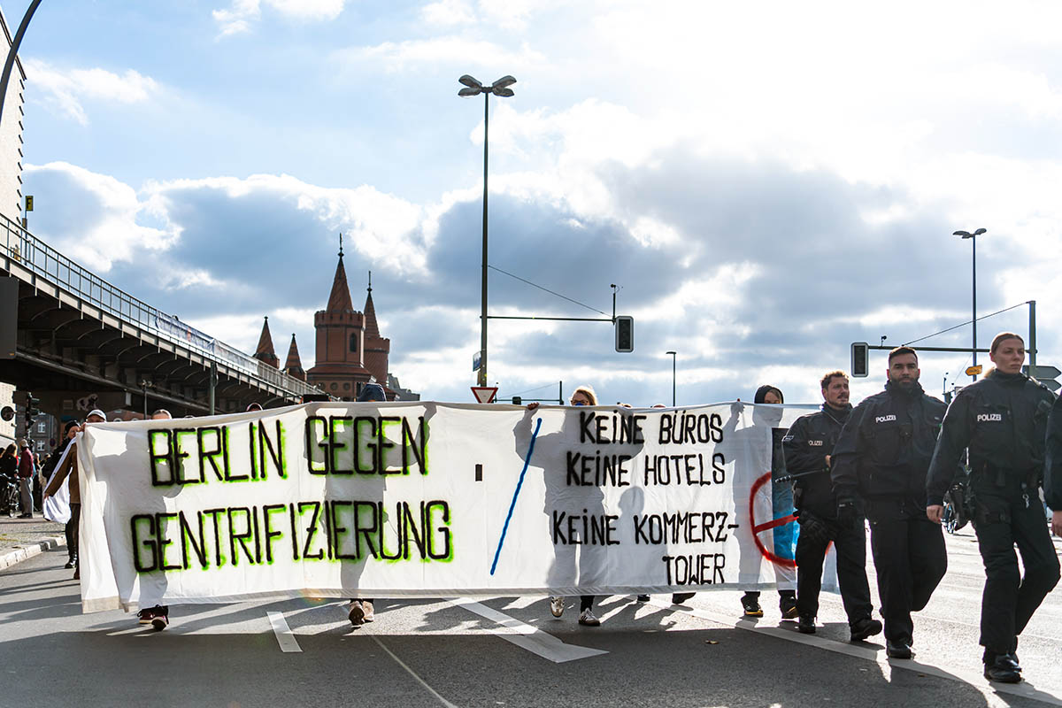 Rund 150 Menschen protestierten am 11. Oktober 2025 in Friedrichshain gegen den Ausverkauf der Stadt, den geplanten Bau weiterer Wolkenkratzer an der Warschauer Straße und die fortschreitende Gentrifizierung im Bezirk. Investoren planen dort zwei weitere Hochhäuser für ein Hotel, Luxuswohnraum und Gewerbeflächen.