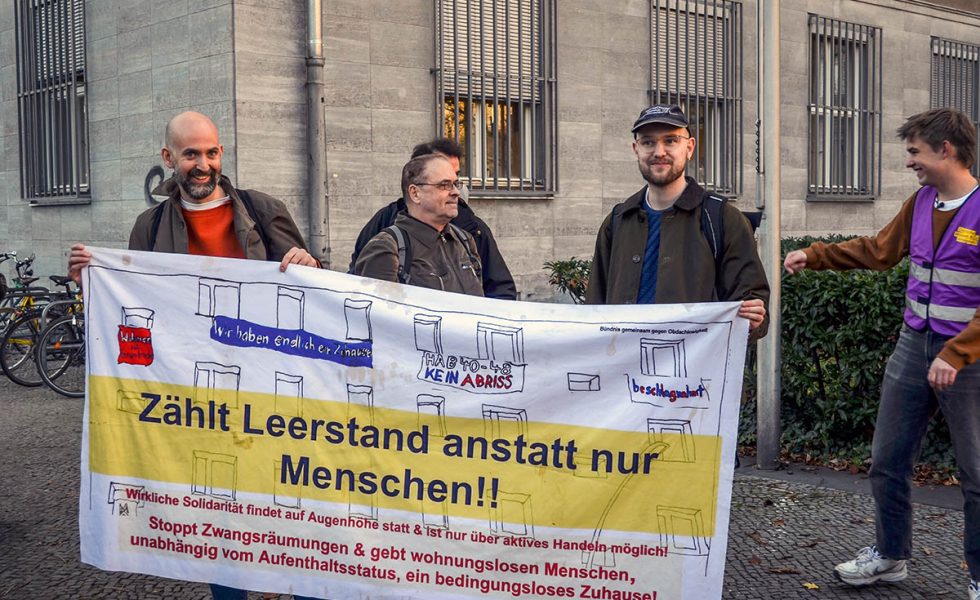Statt diese kriminellen Machenschaften zu unterbinden, hat die Polizei in den vergangenen Tagen Räumungen wegen Versäumnisurteilen durchgeführt. Für die betroffenen Menschen wurde kein Ersatzwohnraum angeboten, sie sind nun wieder wohnungslos.