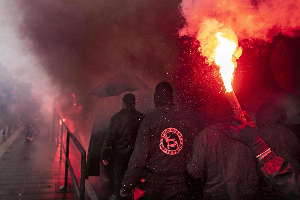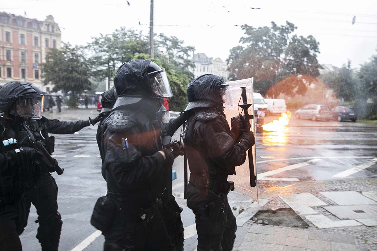 Auf der gesamten Route werden Bengalos und Rauchtöpfe gezündet. Die Polizei ist zwar mit einem Großaufgebot vor Ort, aber hält sich zunächst zurück. Aus sicherer Distanz und aus der Luft beobachtet und filmt sie das Demogeschehen.